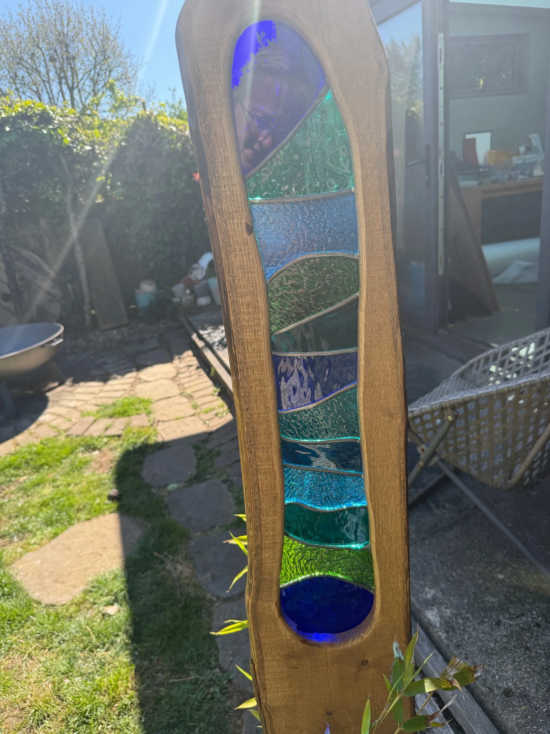 Handmade sculpture made using reclaimed wood and stained glass.